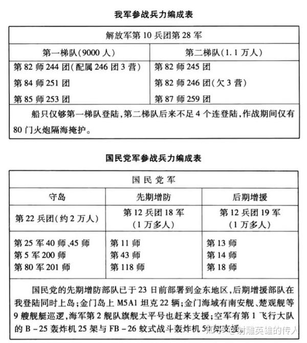 我军兵力部署:10月18日,第28军前指下达了攻击大金门、小金门岛的命令,决定10月20日发起战斗,以第82师、第84师251团、第29军85师253团及第87师259团共6个团的兵力,分两个梯队进攻大金门岛。得手后,再以第85师的2个团攻占小金门岛。